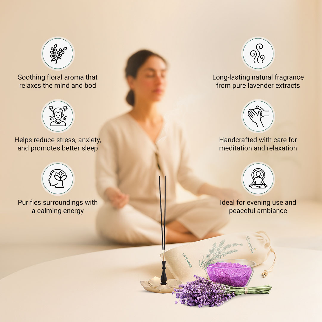 Infused with the soothing fragrance of pure Lavender essential oil, these Elements Lavender Incense Sticks bring balance to your mind and serenity to your space. Hand-rolled with organic herbs and resins, every stick releases a soft floral aroma that melts away tension and restores harmony.