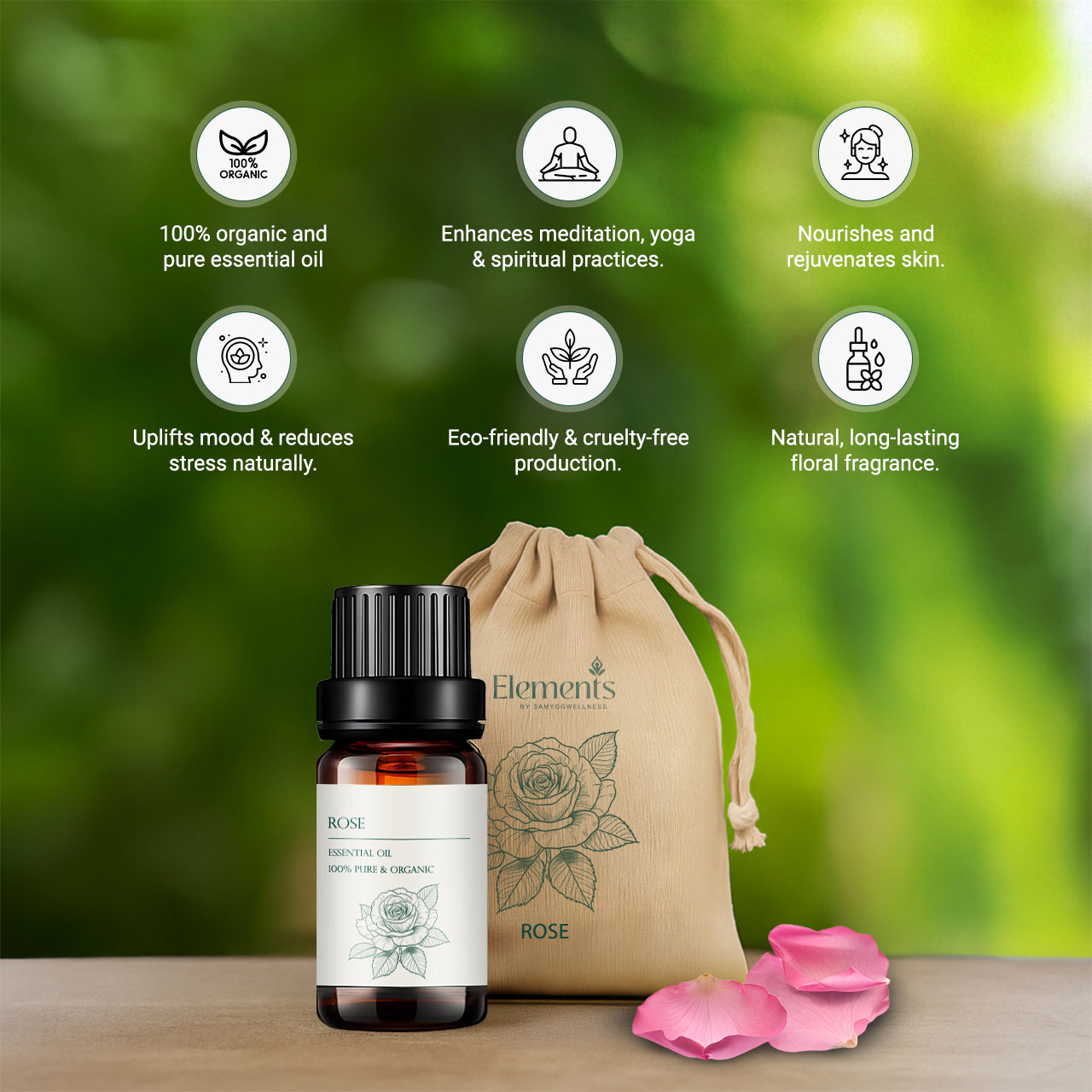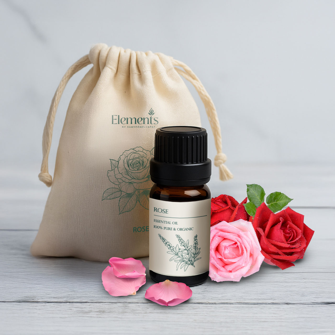 Experience the enchanting aroma of Elements Rose Essential Oil, purely sourced from Kannauj, the world-renowned perfume capital. Crafted using the best traditional steam-distillation techniques, this 100% organic oil captures the luxurious essence of rose