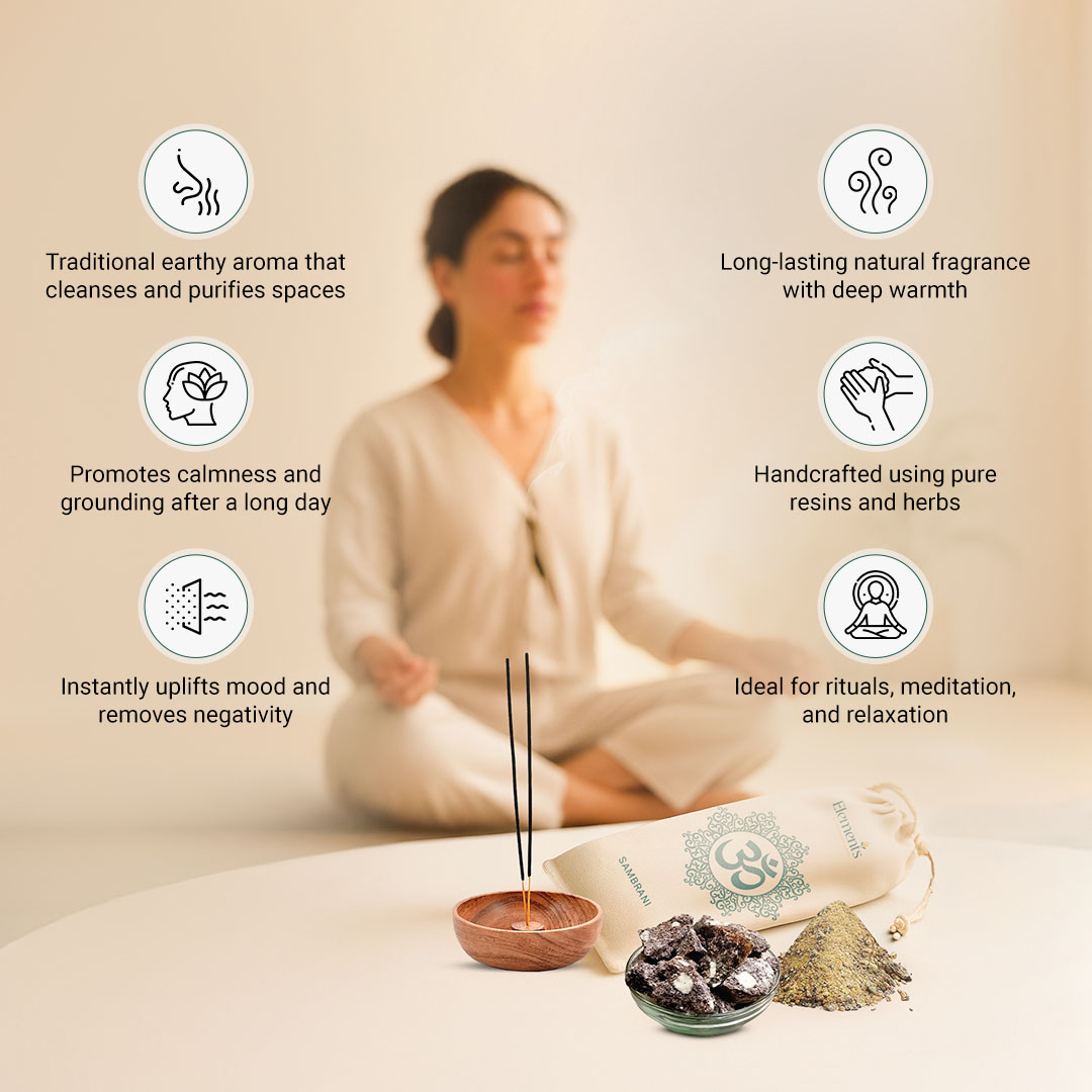 Rooted in ancient Indian rituals, Sambrani is known for its warm, earthy, and purifying aroma. Each Elements Sambrani Incense Stick is hand-rolled using natural resins and pure Sambrani extract, offering a sacred fragrance that cleanses your space, uplifts the spirit, and invokes a deep sense of devotion.